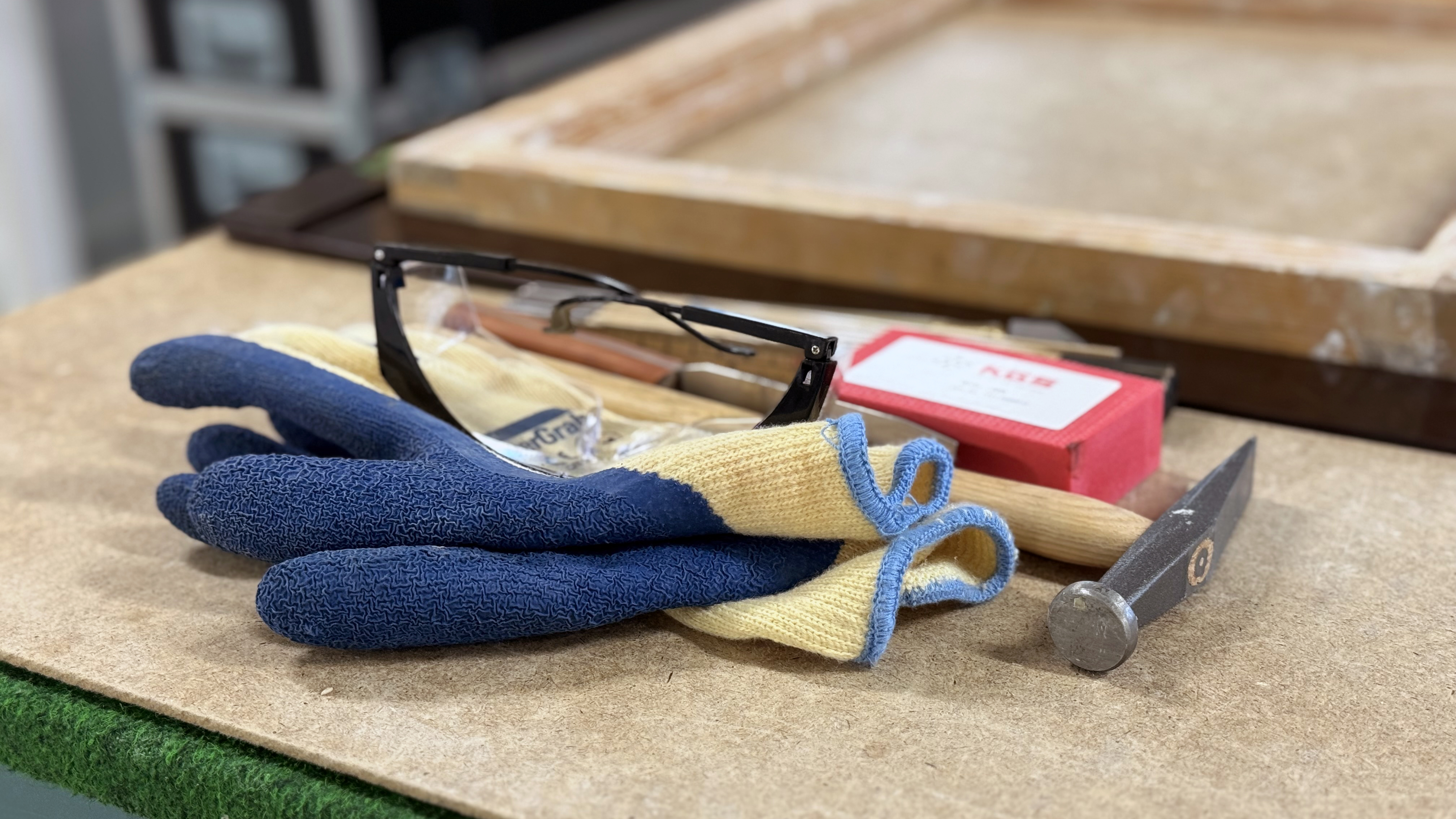 Skyddshandskar, skyddsglasögon och hammare på ett bord.